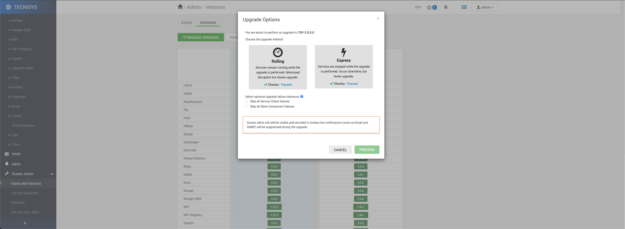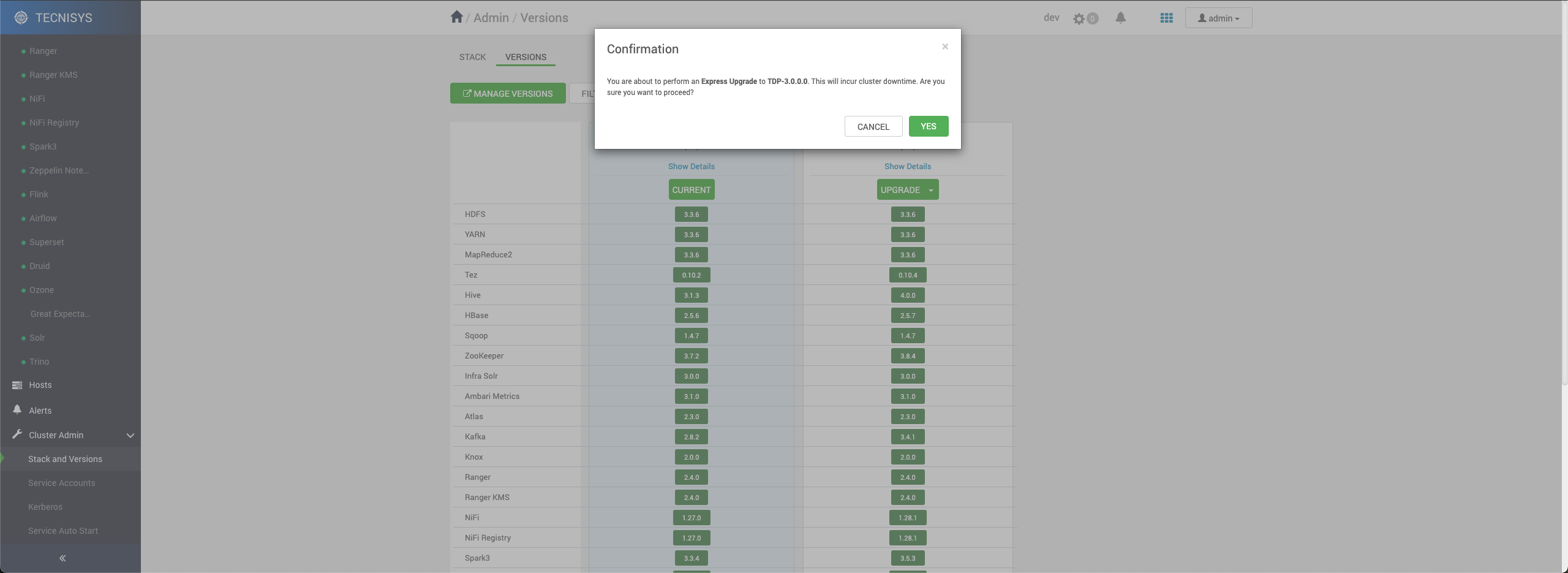 O Express Upgrade é uma opção que permite a atualização dos componentes do Cluster para uma a nova versão de forma rápida e segura. Contudo, esta opção requer a parada total dos serviços do Cluster.