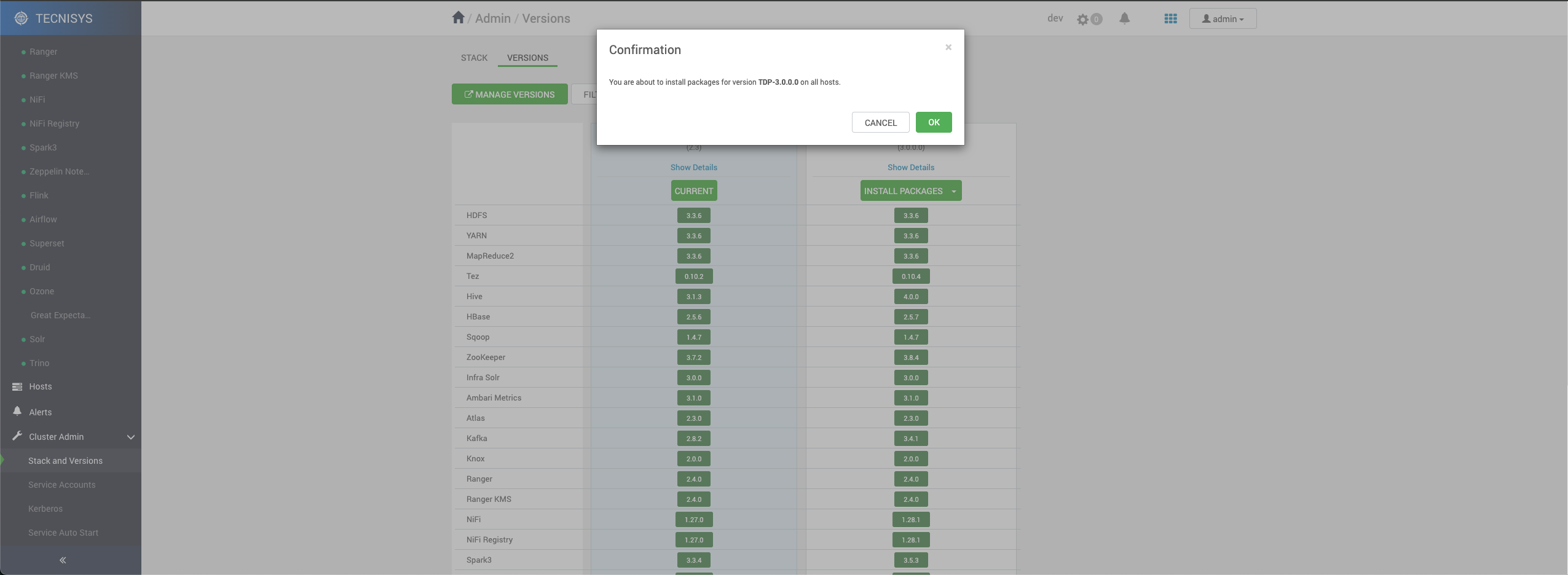 A atualização dos componentes é realizada através do Ambari. O processo é dividido em duas etapas: instalação dos pacotes disponíveis na nova versão e execução do upgrade.