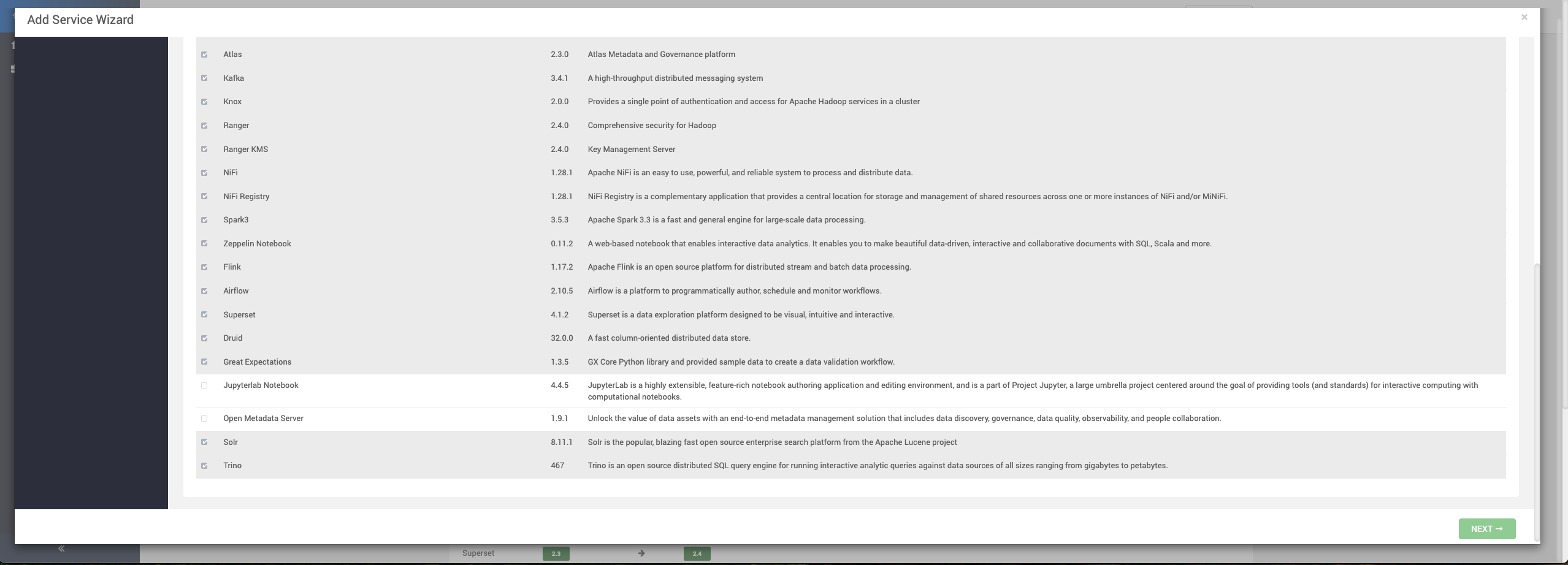 Agora, na guia STACK da página "Stack and Versions" é possível adicionar os novos serviços disponíveis na nova versão do TDP.
