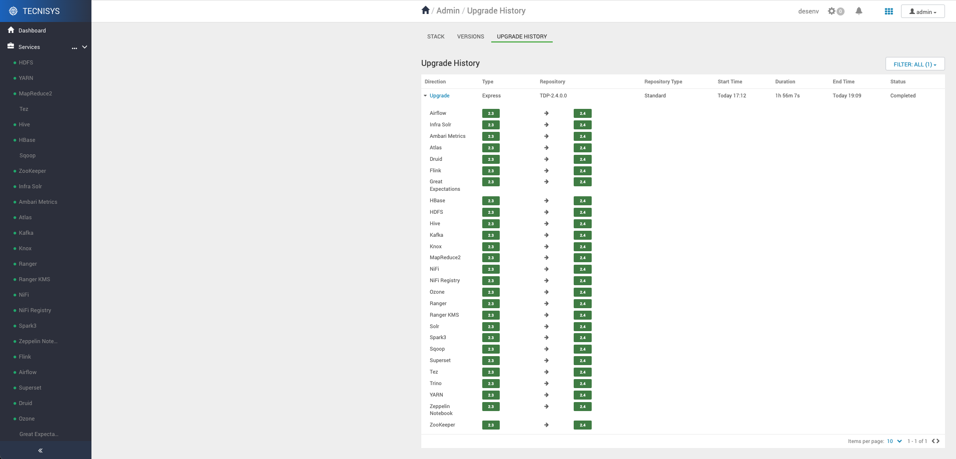 Note que a guia UPGRADE HISTORY foi adicionada à página "Stack and Versions". Nesta guia é apresentado o histórico de atualizações do cluster, incluindo detalhes como o tipo de upgrade realizado, a versão anterior e a nova versão da stack e seus serviços.